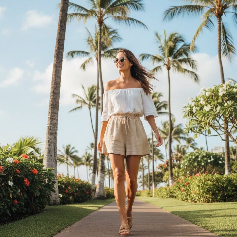 High-waisted linen shorts styled with a breezy off-shoulder top create a relaxed yet polished vibe. Neutral tones like beige or white keep it fresh, while woven sandals and oversized sunglasses complete the easygoing tropical aesthetic perfect for exploring local markets or beach towns.