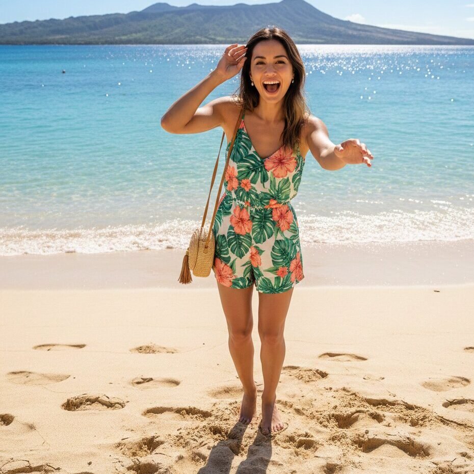 A vibrant tropical print romper is playful and practical for warm Hawaiian days. Look for palm leaf or botanical patterns in bold greens and corals. Add espadrilles and a straw crossbody bag for a cute, comfortable outfit that transitions smoothly from sightseeing to sunset cocktails.