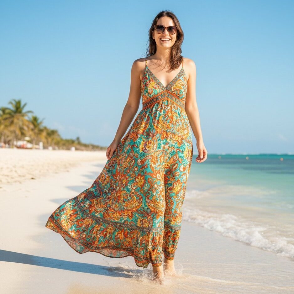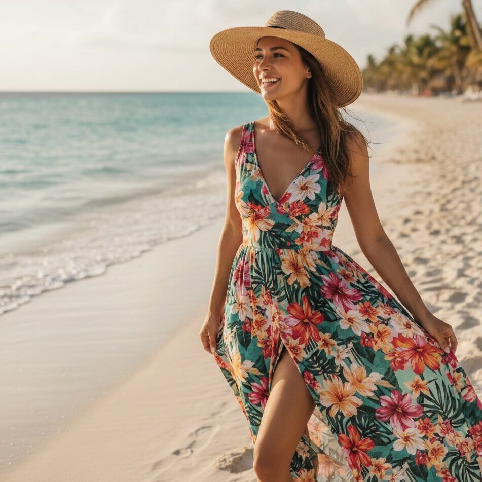 A lightweight floral maxi dress is perfect for beach walks and sunset dinners. Choose breathable fabrics like cotton or chiffon in bright tropical shades. Pair it with a wide straw hat and flat sandals for an easy, elegant look that feels both relaxed and picture-perfect.