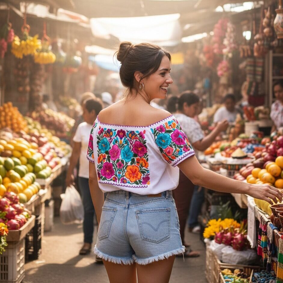 Classic denim shorts paired with a colorful embroidered blouse capture a true Mexican-inspired aesthetic. This combo is comfortable for sightseeing and exploring markets. Add comfy sandals and a woven tote bag for a laid-back, cultural vibe.
