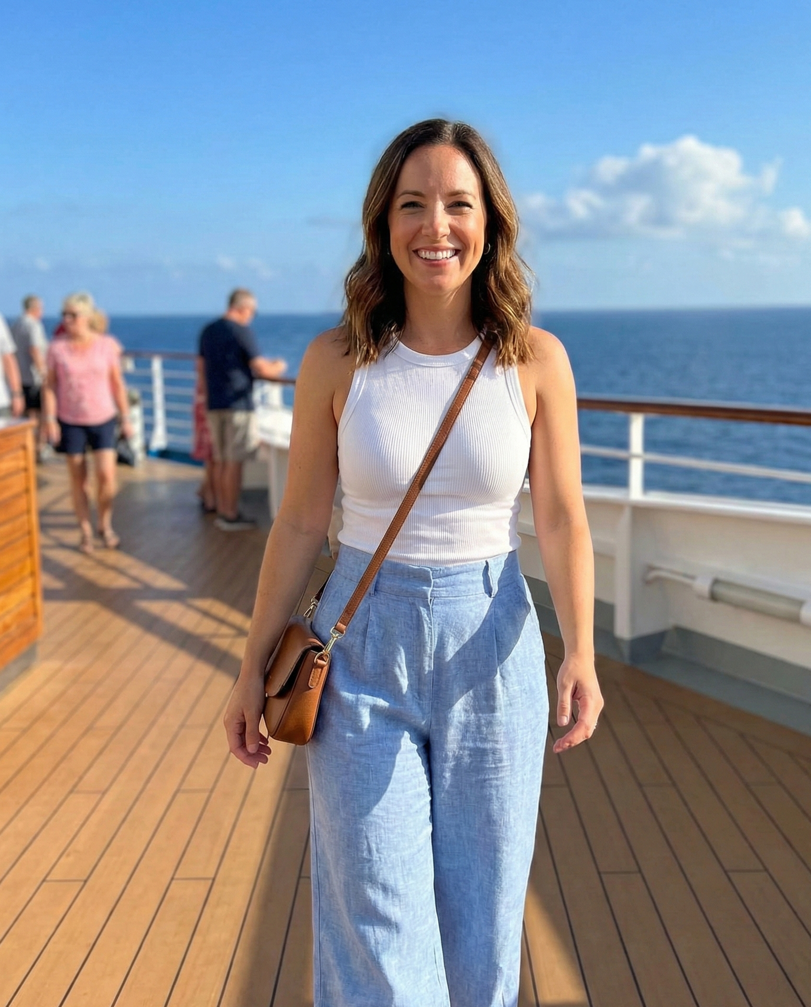 High-waisted wide-leg pants paired with a fitted tank top create a balanced silhouette. This outfit is comfortable for exploring ports while still looking stylish. Finish with comfy sneakers or flat sandals and a crossbody bag for a practical yet trendy cruise ensemble.
