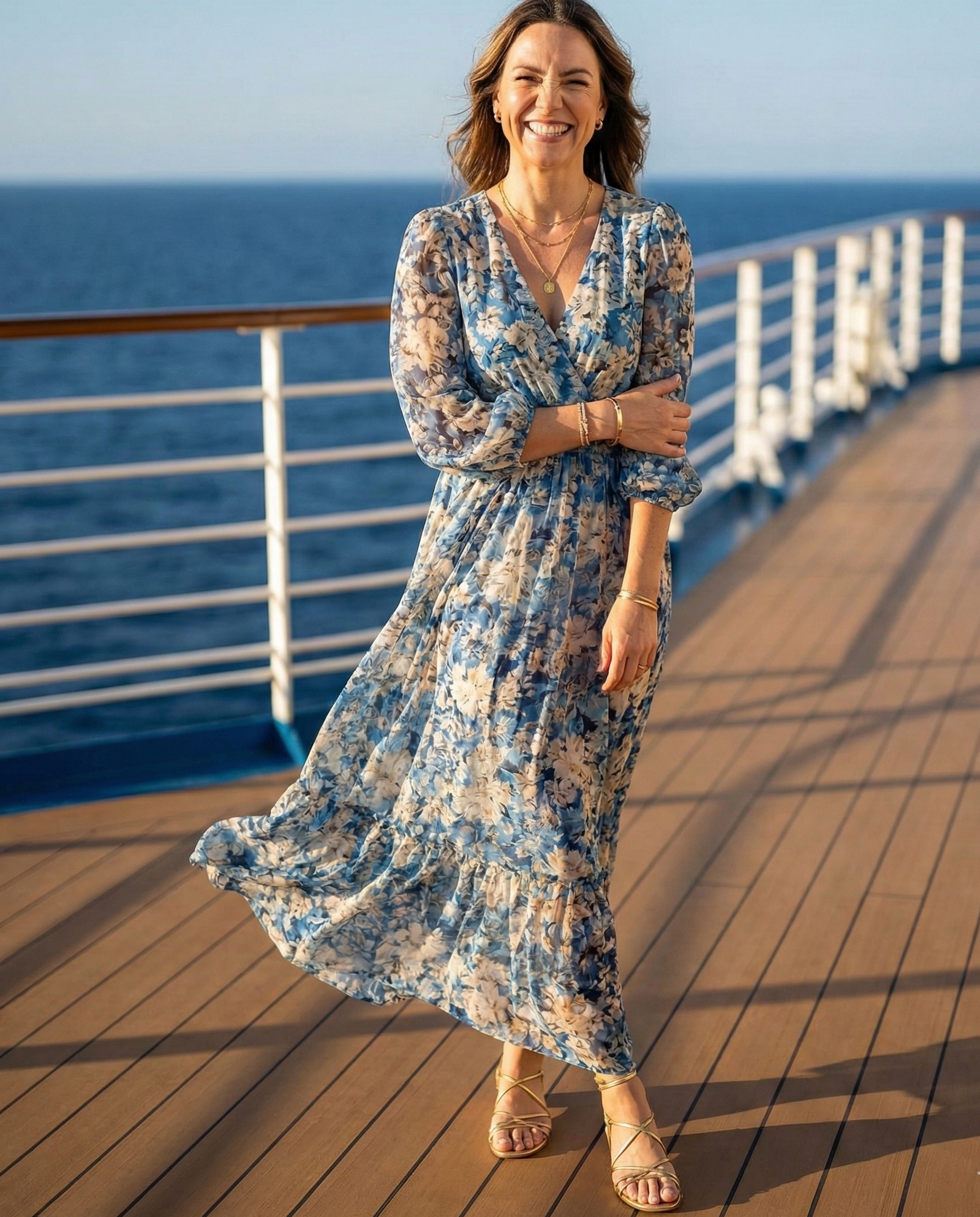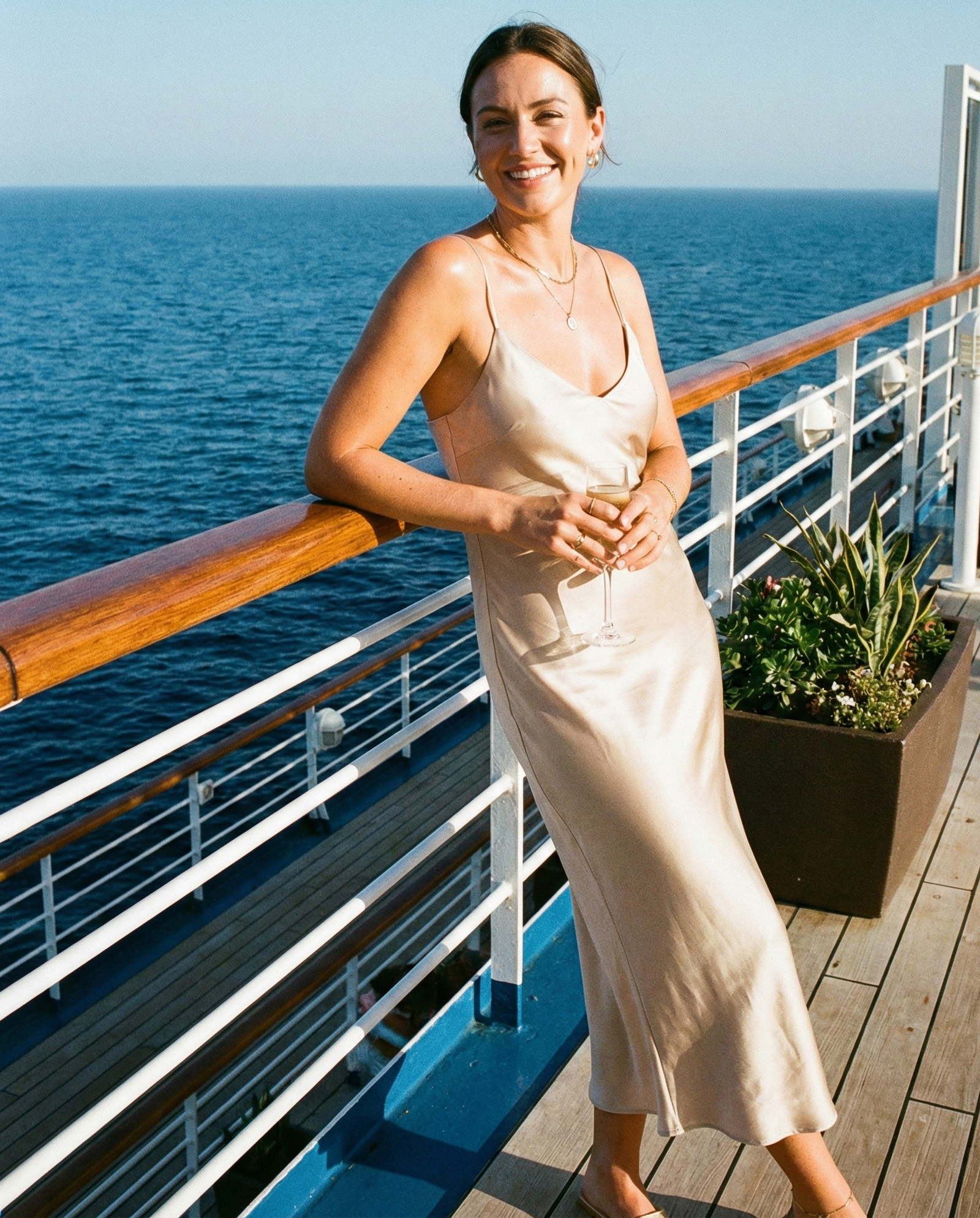 A lightweight flowy maxi dress is perfect for sunny sea days. Soft fabrics like chiffon or cotton keep you cool while the relaxed silhouette feels effortless. Pair it with strappy sandals and delicate jewelry for a look that transitions seamlessly from deck lounging to casual sunset dinners.