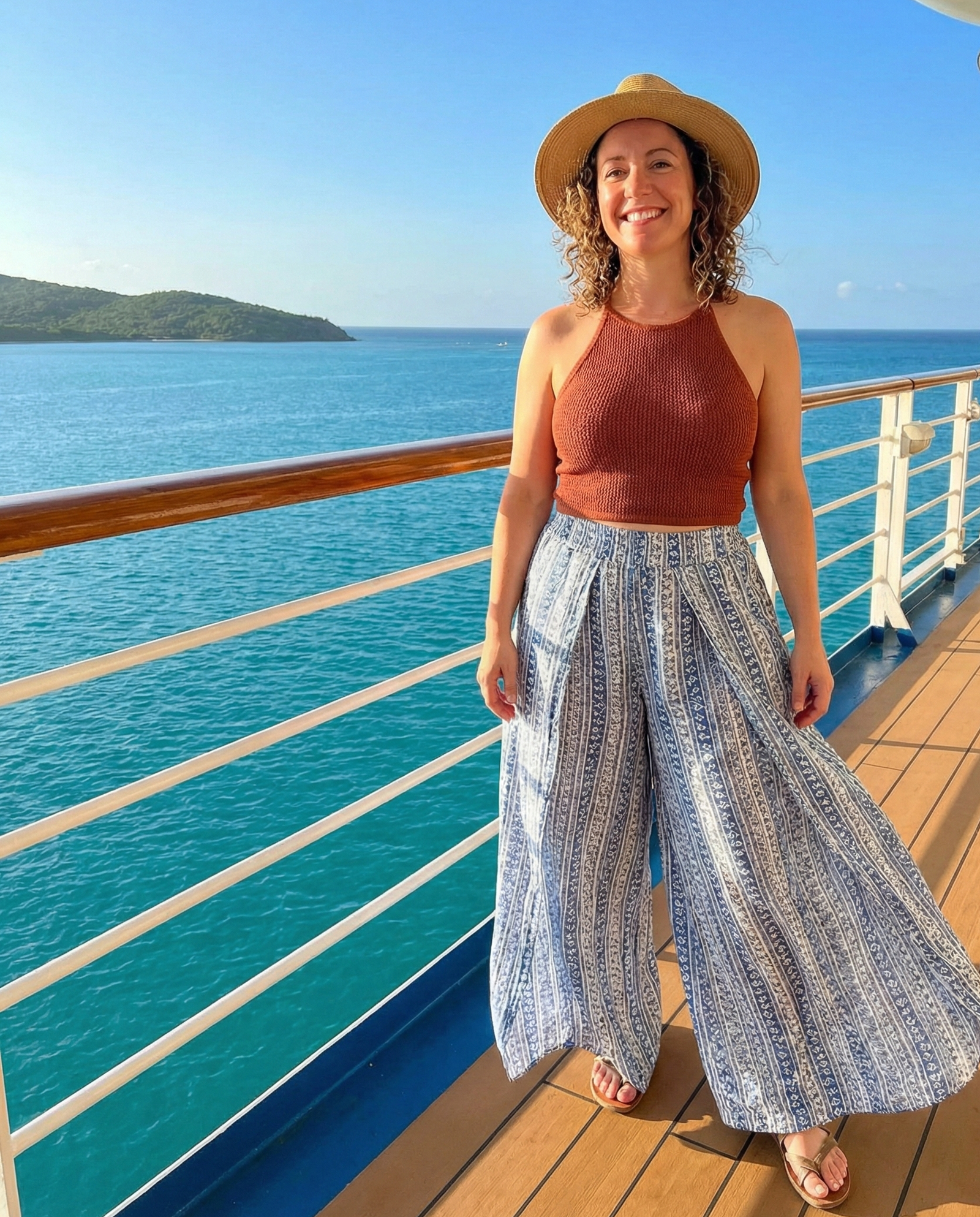 Palazzo pants offer comfort and dramatic flair. Pair them with a fitted halter top to create a flattering contrast. This outfit works beautifully for tropical evenings, especially when styled with statement earrings and sleek sandals for a refined cruise look.