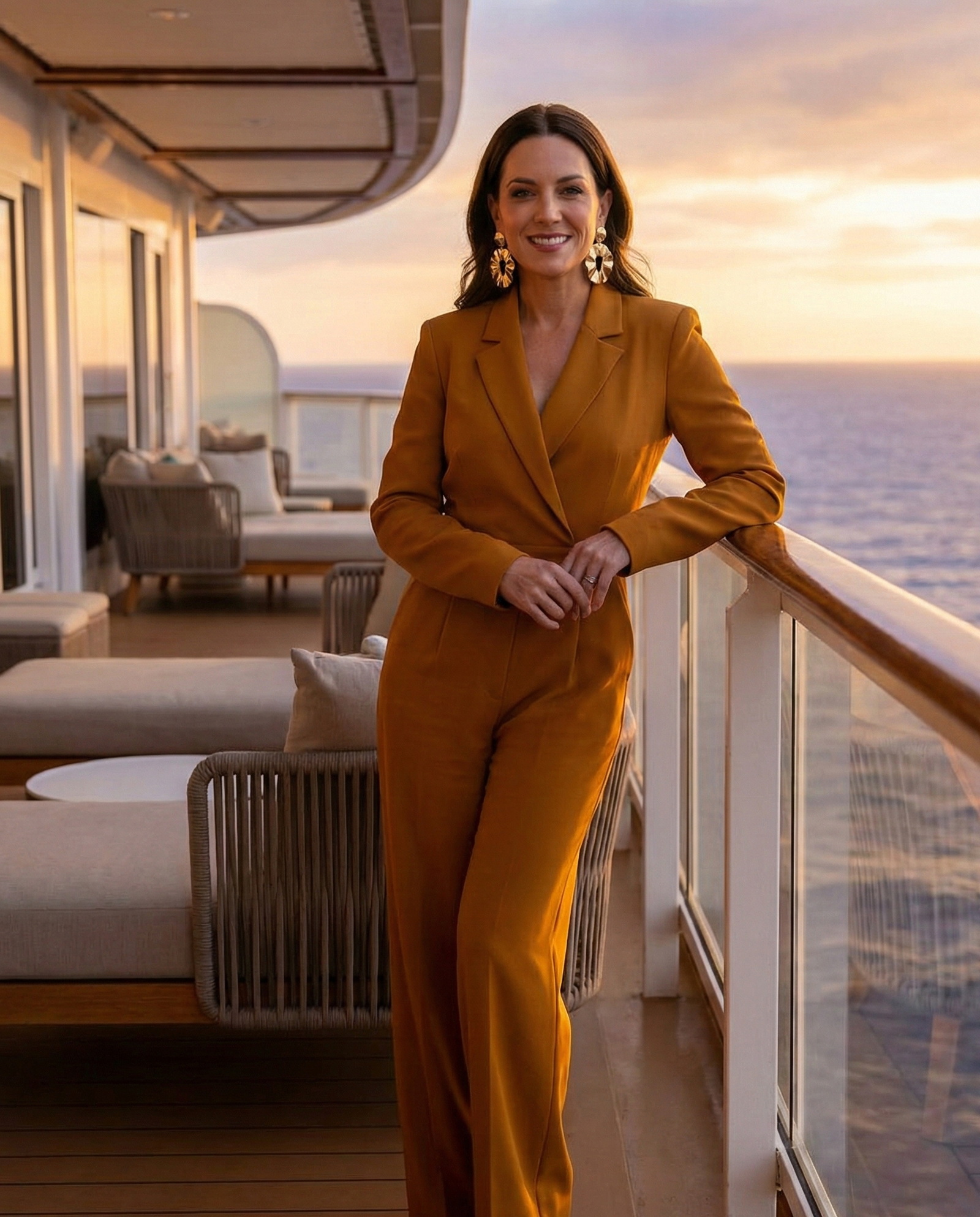A tailored jumpsuit is a modern alternative to a dress for cruise dinners. Look for wide-leg or belted styles that flatter your shape. Add statement earrings and heeled sandals for an effortlessly chic evening outfit that feels both bold and refined.